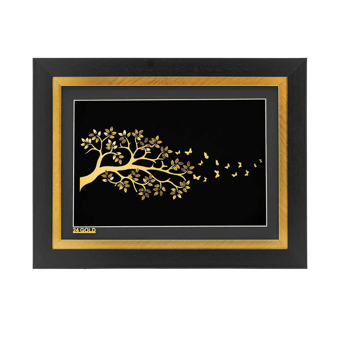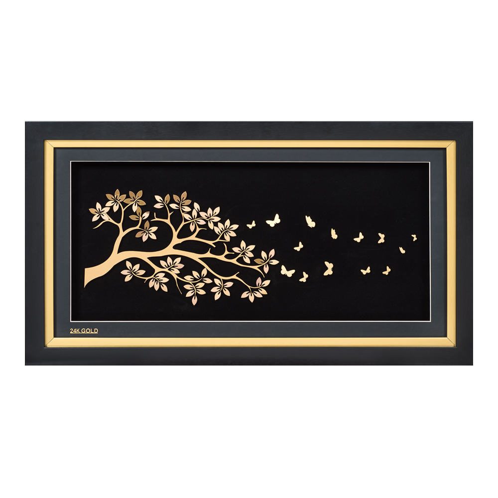 - تابلو درخت ورق طلای درخت و پروانه: یکی از مدل های جدید و پرفروش که با ترکیب درخت طلایی و پروانه های ظریف طراحی می شود. پروانه ها در این طرح نماد تحول، آزادی و زیبایی هستند و حضورشان در کنار درخت طلایی، حس زنده بودن و پویایی را تقویت می کند. در این مدل معمولاً پروانه ها با رنگ طلایی یا ترکیب نقره و طلا روی شاخه های درخت یا اطراف آن قرار می گیرند تا حرکت و لطافت در اثر تداعی شود. این سبک به ویژه برای فضاهای نشیمن یا اتاق خواب، که نیاز به انرژی مثبت و لطافت دارد، بسیار محبوب است.